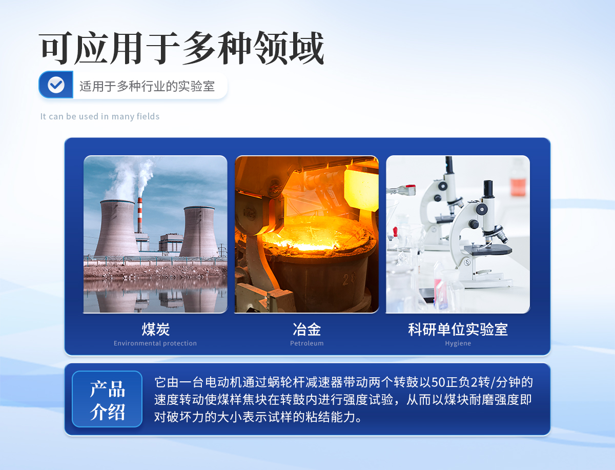 該儀器是測定煉焦用煤的粘結(jié)能力——羅加指數(shù)及粘結(jié)指數(shù)的專用儀器。適用于煤炭,冶金焦化部門及科研單位的實驗室專用。它由一臺電動機(jī)通過蝸輪桿減速器帶動兩個轉(zhuǎn)鼓以50正負(fù)2轉(zhuǎn)/分鐘的速度轉(zhuǎn)動,使煤樣焦塊在轉(zhuǎn)鼓內(nèi)進(jìn)行強(qiáng)度試驗,從而以煤塊耐磨強(qiáng)度——即對破壞力的大小表示試樣的粘結(jié)能力。