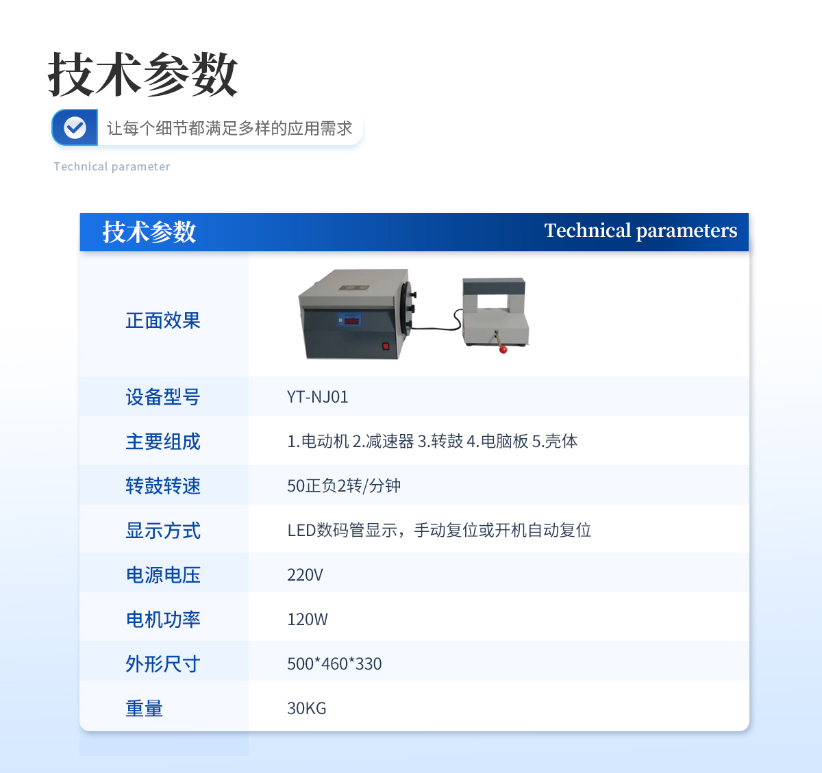 1.轉(zhuǎn)鼓轉(zhuǎn)速 50正負(fù)2轉(zhuǎn)/分鐘 | 2.顯示方式 LED數(shù)碼管顯示,手動復(fù)位或開機(jī)自動復(fù)位 | 3.電源電壓 220V | 4.電機(jī)功率 120W | 5.外形尺寸 500*460*330 | 6.重量 30KG |