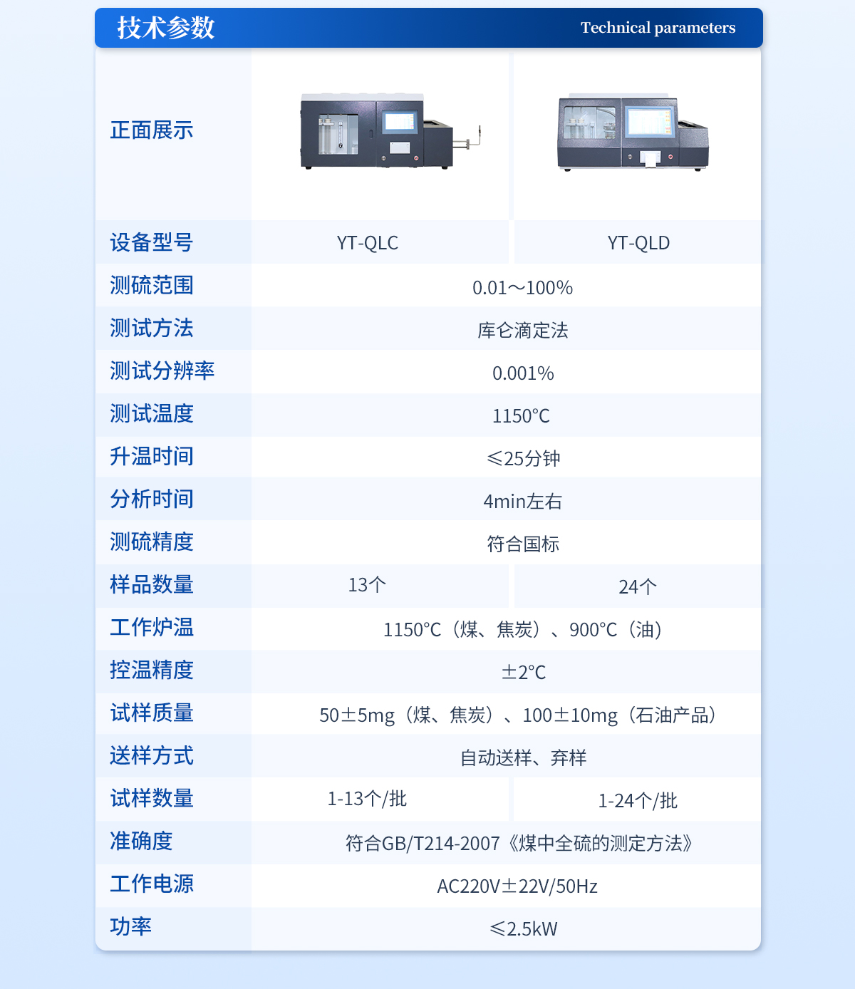 | 1.硫的測量范圍:0—40%. | 2.單個試樣燃燒分析時間:約5--7分鐘,其中在500℃處停留45秒,1050℃處停留4分45秒。 | 3.控溫:精度±5℃。測溫:精度0.5級;加熱體為硅碳管,高溫區長度≥90毫米,溫度為1050℃±5℃(根據需要可調節溫度) | 4.精密度:如下表規定: | St,%<1 1="">4 | 重復性St,ad,% 0.05 0.10 0.20 | 再現型St,d,% 0.10 0.20 0.30 | 5.升溫速度:20--25℃/分,約30分鐘可達1050℃。 | 6.電解池:容積為450毫升,鉑電解電極面積150mm2 。 | 7.供電電源:220(1±10%)V,50Hz. | 8.儀器尺寸(mm) 長×寬×高(770×460×410) |
