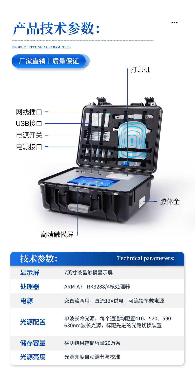 7、一體化便攜式快檢設備,滿足現場及流動檢測使用需求,能夠在同一軟件下實現所有檢測項目的檢測,并可通過同一窗口直觀顯示檢測結果。