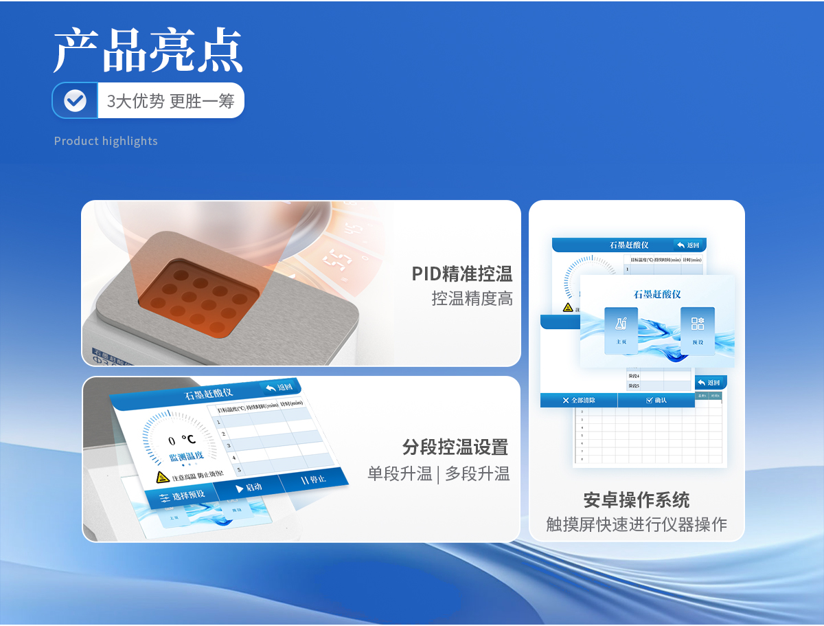 | 使用5寸彩色觸摸屏進行儀器操作,配備安卓操作系統(tǒng),方便快捷。 | 采用PID 控溫技術(shù),控溫精度高,升溫速度快, 從室溫到260℃僅需25分鐘。 | 分段控溫設(shè)置,即可單段升溫,也可多段升溫,設(shè)置靈活,儀器將自動按順序完成。更適于易產(chǎn)生泡沫的樣品。 | 采用優(yōu)質(zhì)石墨爐內(nèi)芯,平均溫差較小,樣品效果一致性好,熱傳導(dǎo)效率更高。石墨塊具有特氟龍涂層,耐腐蝕,延長使用壽命。 |