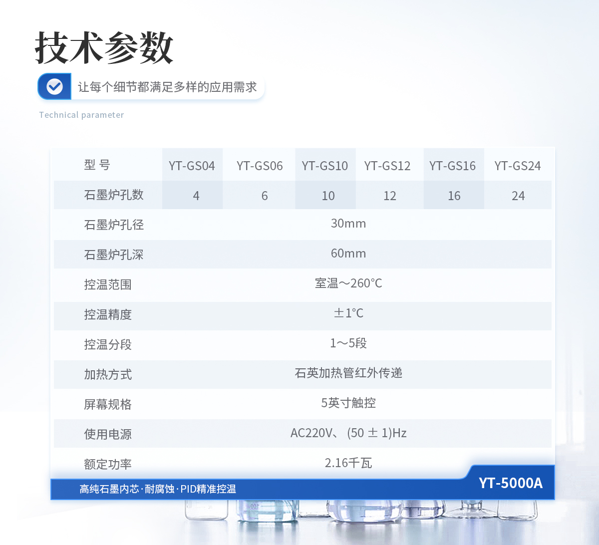 | 石墨爐孔:孔徑30mm,孔深60mm,孔數(shù)5×2 | 控溫范圍:室溫~260℃ | 控溫精度:±1℃ | 控溫分段:1~5段 | 加熱方式:石英加熱管紅外傳遞 | 屏幕規(guī)格:5寸觸控 | 主機外型尺寸:寬522mm×深371mm×高168mm | 使用電源:AC220V、 (50 ± 1)Hz | 額定功率:1.6千瓦 |