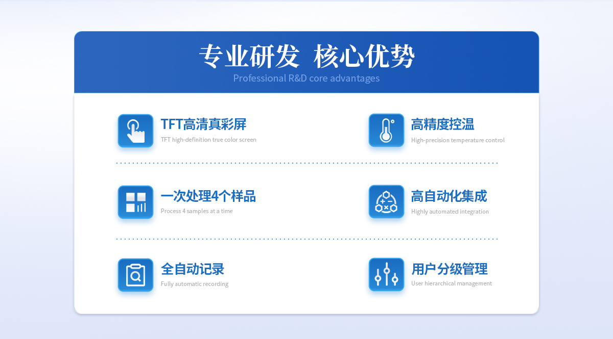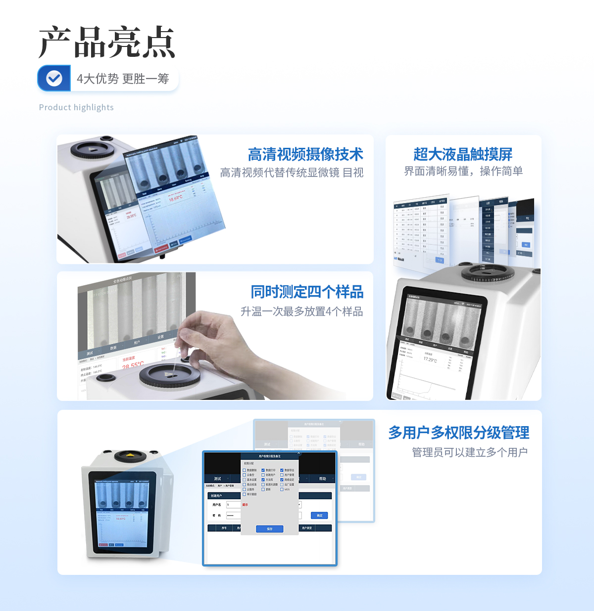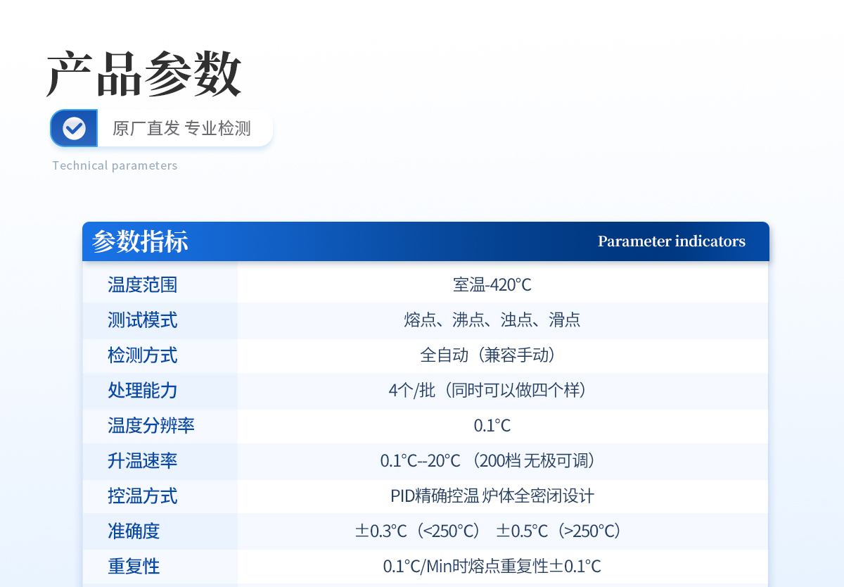 | 1、自動化集成,實現一鍵測定功能; | 2、一次處理4個樣品; | 3、高清視頻代替傳統顯微鏡 目視高; | 4、全自動記錄熔程,初熔,終熔; | 5、可通過打印機直接打印數據; | 6、符合21CFR Part 11、審計追蹤、藥典及電子簽名; | 7、符合GLP要求規范。 |