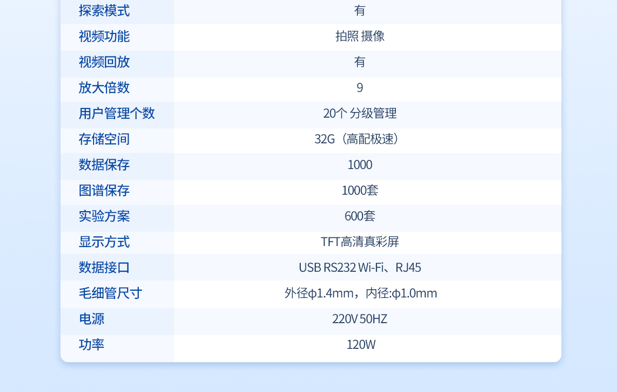 | 溫度范圍:室溫-400℃ | 檢測方式:全自動(兼容手動) | 處理能力:4個/批(同時可以做四個樣) | 溫度分辨率:0.01℃ | 升溫速率:0.1℃--20℃ (200檔 無極可調) | 控溫方式:PID**控溫 爐體全密閉設計 | 加熱方式:電熱塊空氣加熱法 | 升溫分辨率:≤0.1℃ | 升溫速率::0.1℃/Min--20℃/Min | 準確度:±0.2℃(<200℃)、±0.4℃(>200℃) | 重復性:0.1℃/Min時熔點重復性±0.1℃ | 校正功能:具備 | 探索模式:有 | 視頻功能:拍照 攝像 | 視頻回放:有/有時間水印 | 高清攝像頭:觀察樣品熔融狀態 | 放大倍數:≥20 | 用戶管理個數:500個以上 分多級管理 | 存儲空間:64G硬盤,≥2G內存 | 試驗方法:有 | 數據保存:有 | 圖譜保存:300套 | 視頻保存:有 | 內存擴展:可以 | 實驗方案:500套 | 審計追蹤:有 | 顯示方式:不小于8寸高清彩屏 | 數據接口:數據接口:USB,網絡WiFi接口,RS232 | 數據真實性:防篡改功能 | 數據導出:可用U盤導出 | 數據輸出形式:PDF格式和EXCL數據 | 數據溢出提醒:提前自動提醒 | 打印機:選配 | 毛細管尺寸:外徑φ1.4mm,內徑:φ1.0mm | 電源:220V 50HZ 功率:120W |