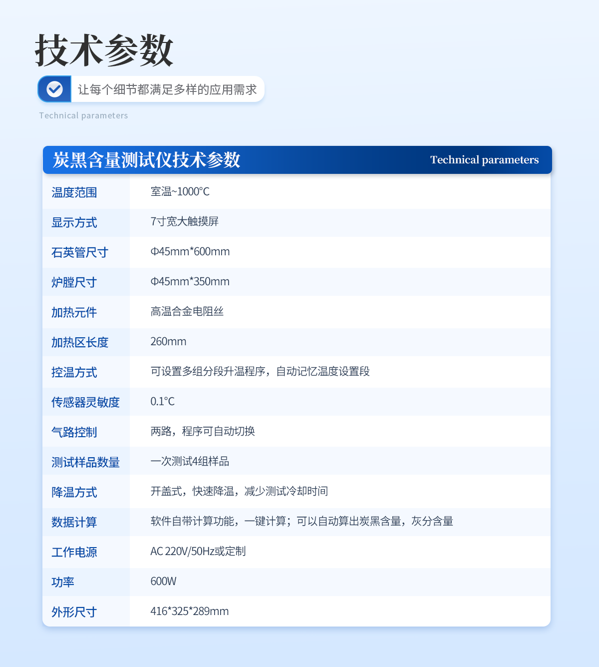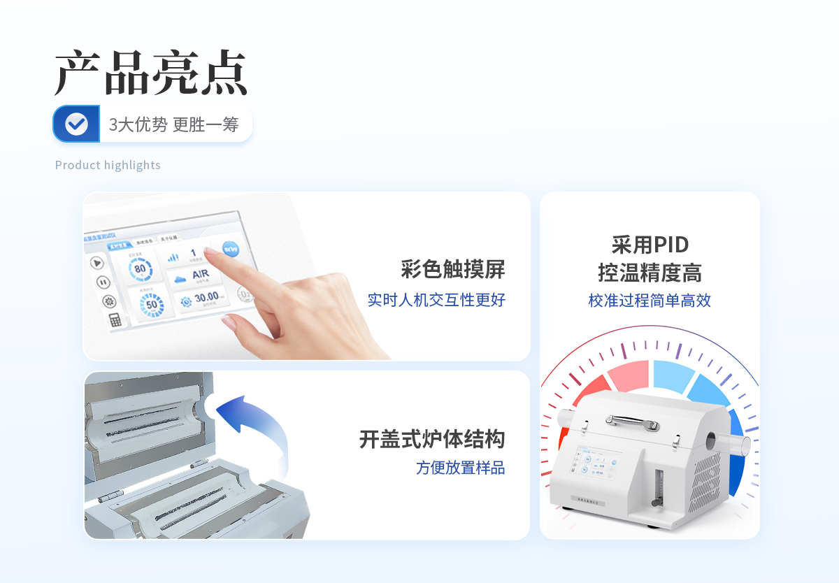 | 1. 采用開蓋式爐體結構,方便放置樣品且散熱效果更佳。 | 2. 爐膛采用超長加熱單元,可同時測試4組樣品,大大提高測試效率。 | 3. 軟件自帶計算功能,可以一鍵自動計算出炭黑含量、灰分含量,非常得方便快捷。 | 4. 采用PID精準控溫,控溫精度高,溫度范圍大,爐膛溫度均勻性高。 | 5. 7寸液晶觸摸屏顯示,可一鍵操作啟動,設定恒溫時間,恒溫精度高; | 6. 智能化可編程控制,可設置多組分段升溫程序。 |