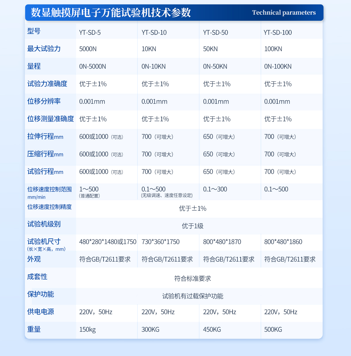 1、 **試驗力:5000N ; | 2、 量 程:0N-5000N; | 3、 試驗力準確度:優(yōu)于±1% | 4、 位移分辨率:0.001mm; | 5、 位移測量準確度:優(yōu)于±1%; | 6、 拉伸行程:600mm或1000mm(可選) | 7、 壓縮行程:600mm或1000mm(可選) | 8、 試驗行程:600mm或1000mm(可選) | 9、 位移速度控制范圍:1mm/min~500mm/min(普通配置) | 10、位移速度控制精度:優(yōu)于±1%; | 11、試驗機級別:優(yōu)于1級 | 12、試驗機尺寸:480*280*1480或1750 mm | 13、外觀:符合GB/T2611要求 | 14、成套性:符合標準要求 | 15、保護功能:試驗機有過載保護功能 | 16、供電電源:220V,50Hz | 17、重量:150kg |
